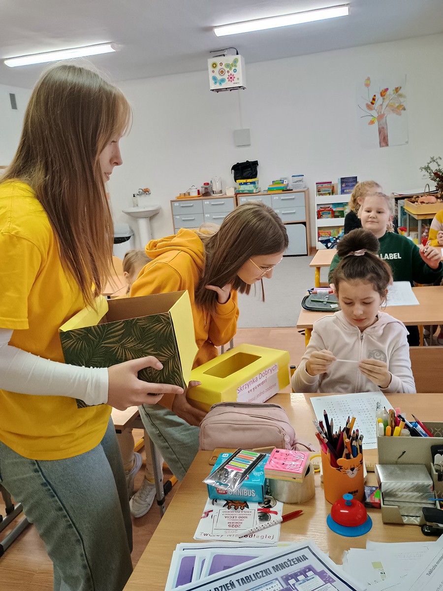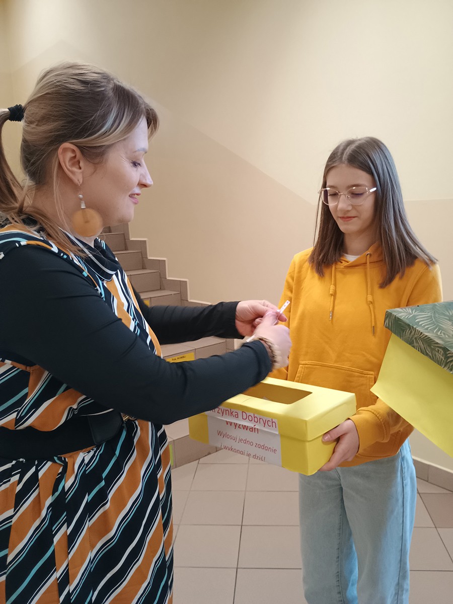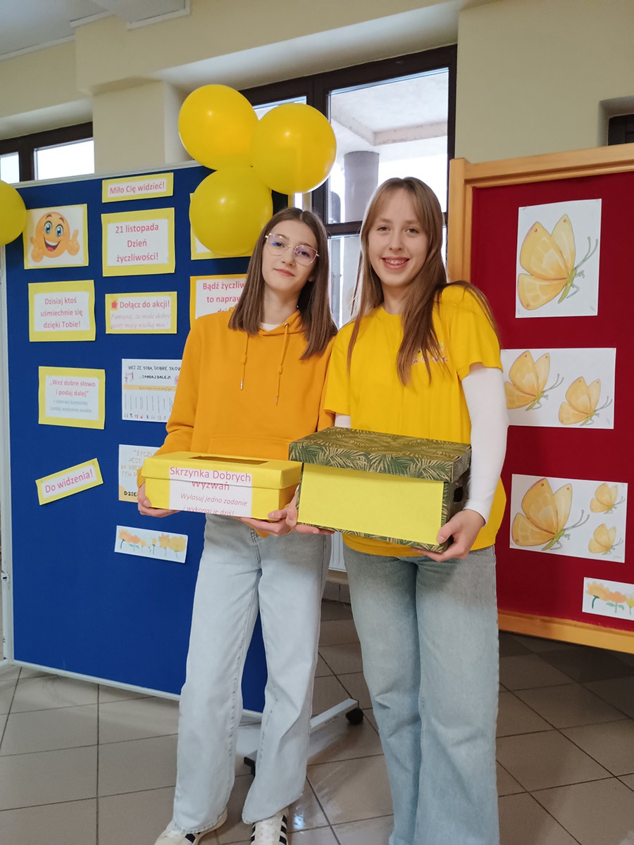 W tym dniu uczniowie byli ubrani na żółto i losowali przygotowane przez Samorząd Uczniowski i jego opiekuna dobre, pozytywne wyzwania. Każde zadanie dawało powód do radości zarówno dzieciom, nauczycielom i pracownikom szkoły. Dzięki temu ten dzień należał do wyjątkowych i pokazał nam, że życzliwość kryje się w małych gestach.