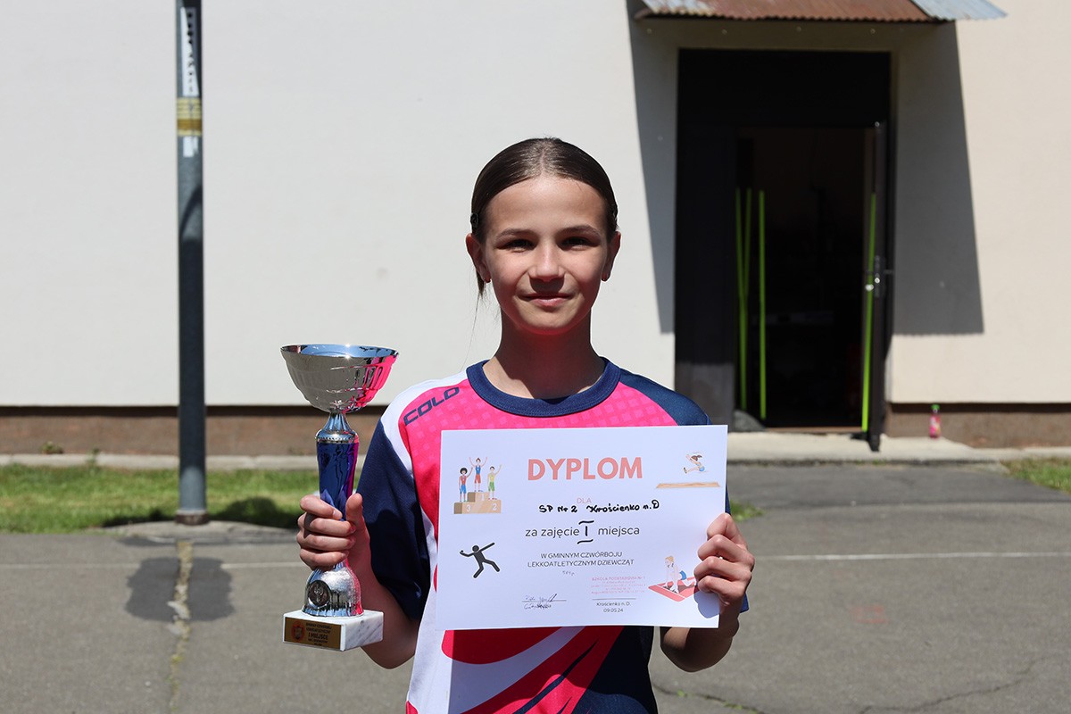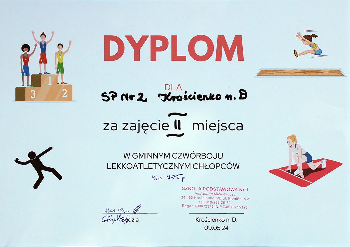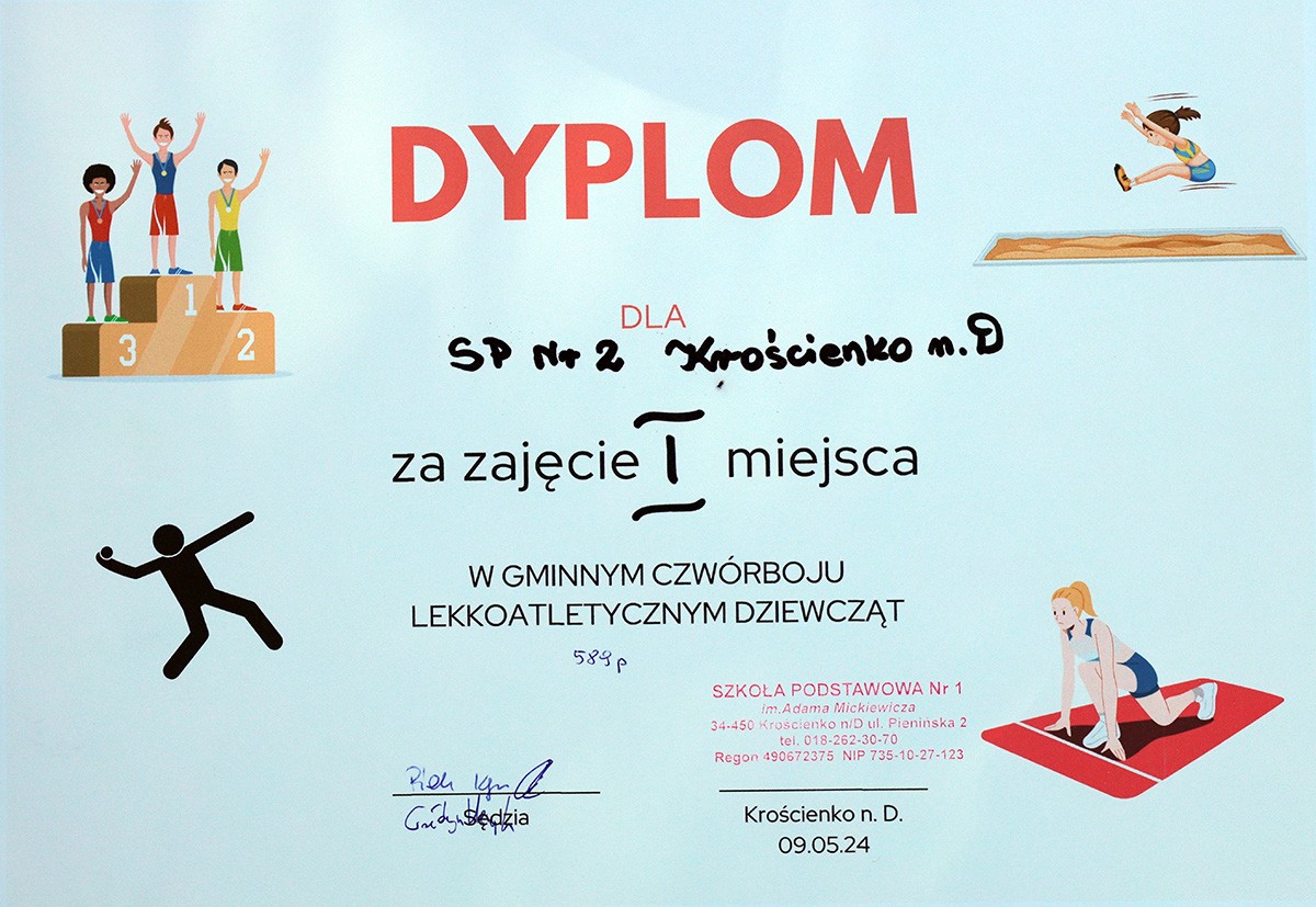 Dzisiaj reprezentacja dziewcząt i chłopców uczestnicznyła w Czwórboju LA w Szkole Podstawowej nr 1 w Krościenku n.D. Drużynowo dziewczyny zajęły I miejsce awansując do kolejnego etapu. Dodatkowo w klasyfikacji indywidualnej dla najlepszych zawodniczek zgarnęły komplet medali. Złoty medal dla Julki Gondek (145 pkt.), srebrny medal - Justyna Wojtarowicz (139 pkt.), brązowy medal - Krolina Król (127 pkt) Chłopcy również dzielnie walczyli i zajęli drużynowo 2 miejsce. GRATULUJEMY!